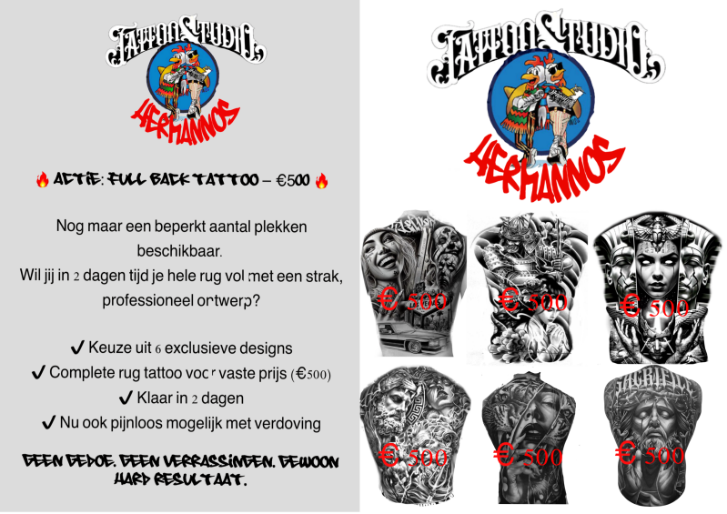 Full sleeve been en Full back of front € 1000 en € 1500 ( 2x dagsessie )